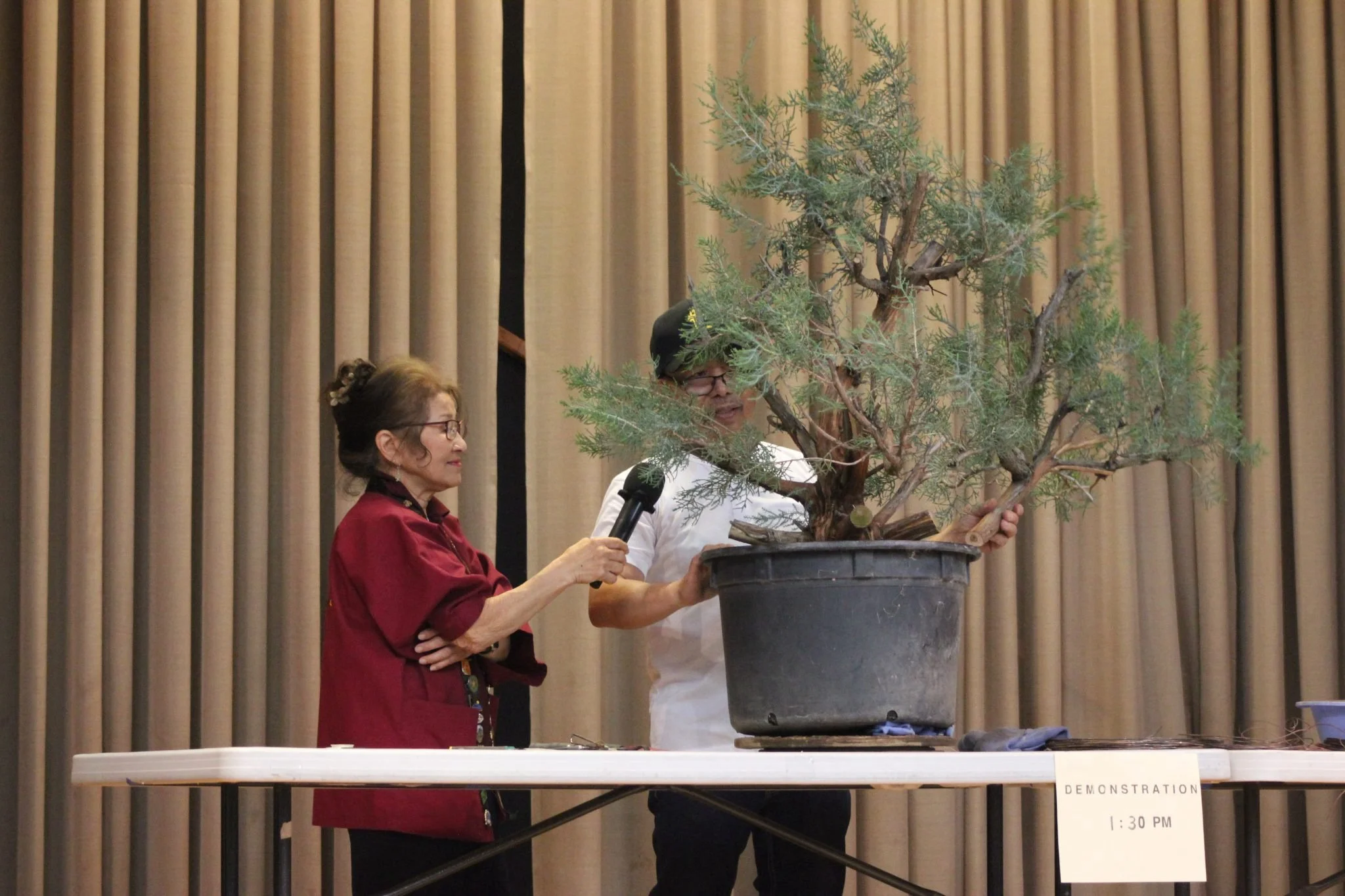 /Sacramento Bonsai Club President Lucy Sakaishi-Judd helps bonsai instructor Sam Adina prepares a demonstration with a California Juniper at the 79th Annual Sacramento Bonsai Show on May 3. (Photo by Chris Woodard)